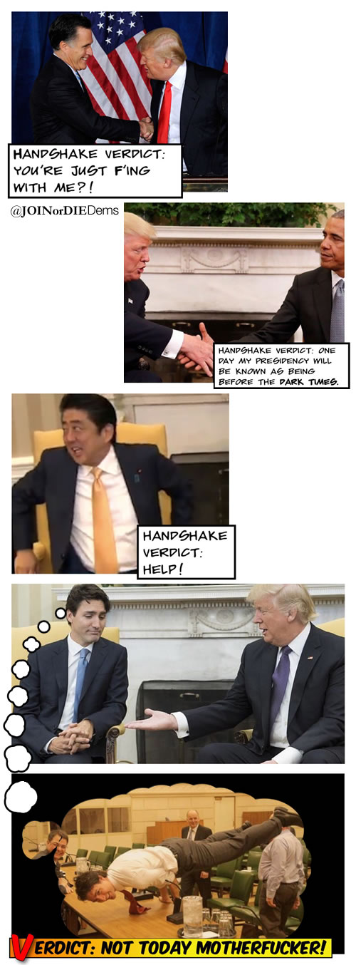 [Photo of 45 extending his hand to Canadian PM, Justin Trudeau. Trudeau appears to be thinking carefully while looking at 45's extended hand.]